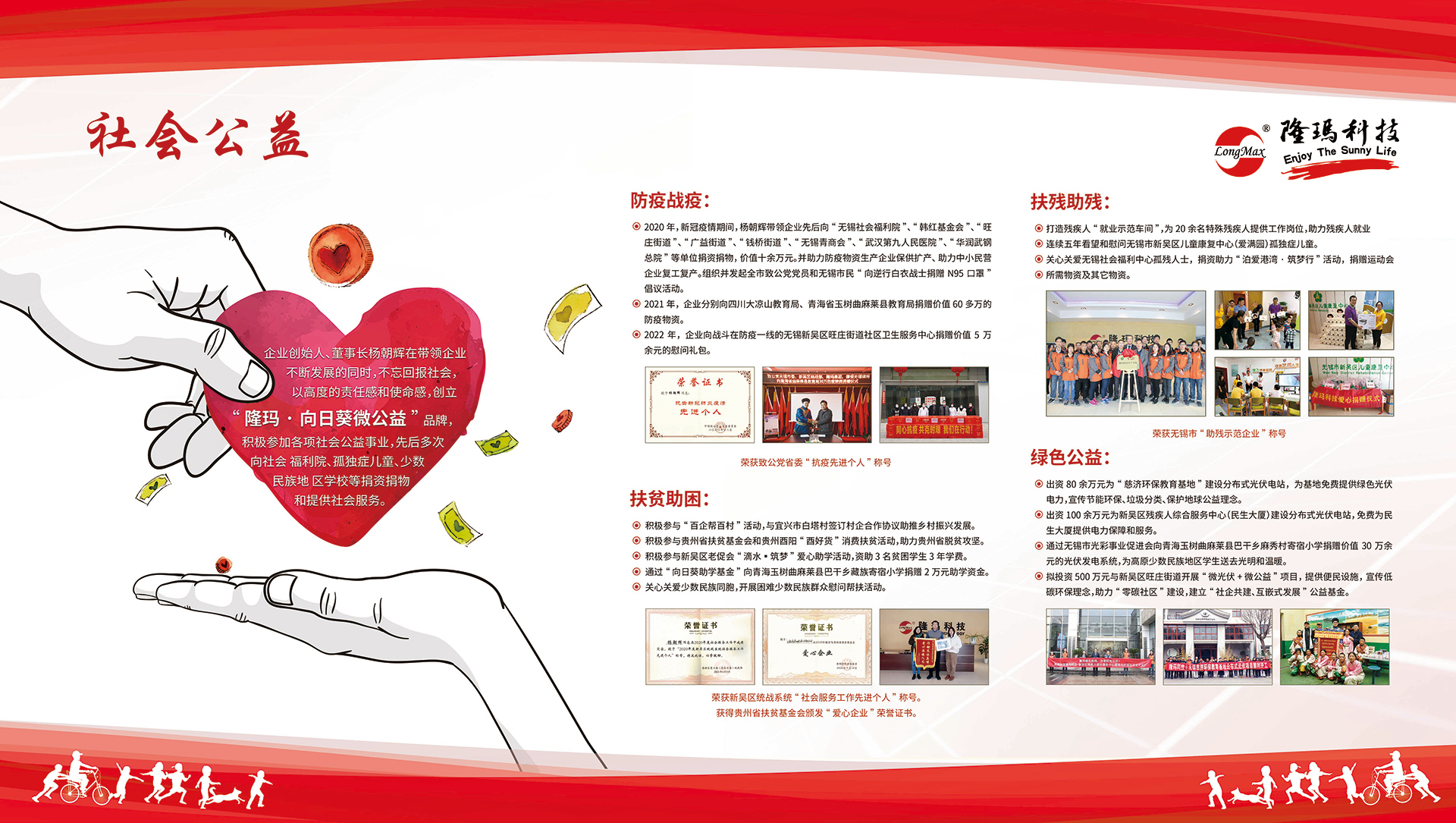 董事長(zhǎng)楊朝輝表示,無(wú)錫隆瑪科技股份有限公司成立至今,堅(jiān)持以“分享陽(yáng)光生活”作為企業(yè)發(fā)展的美好愿景,在不斷發(fā)展的同時(shí),不忘回報(bào)社會(huì),以高度的責(zé)任感和使命感,創(chuàng)立“隆瑪·向日葵微公益”品牌,已連續(xù)參加各項(xiàng)社會(huì)公益事業(yè)21年,先后多次向社會(huì)福利院、孤獨(dú)癥兒童、少數(shù)民族地區(qū)學(xué)校等捐資捐物和提供社會(huì)服務(wù)。未來(lái)我們還將繼續(xù)用這樣一縷微光,去溫暖更多的人。